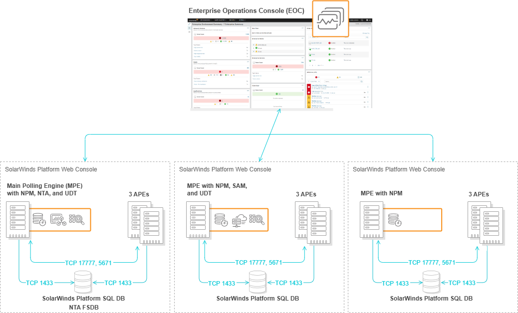 SolarWinds Enterprise Operations Console must be installed and licensed if you want to view aggregated data from multiple SolarWinds Platform servers in a distributed deployment.