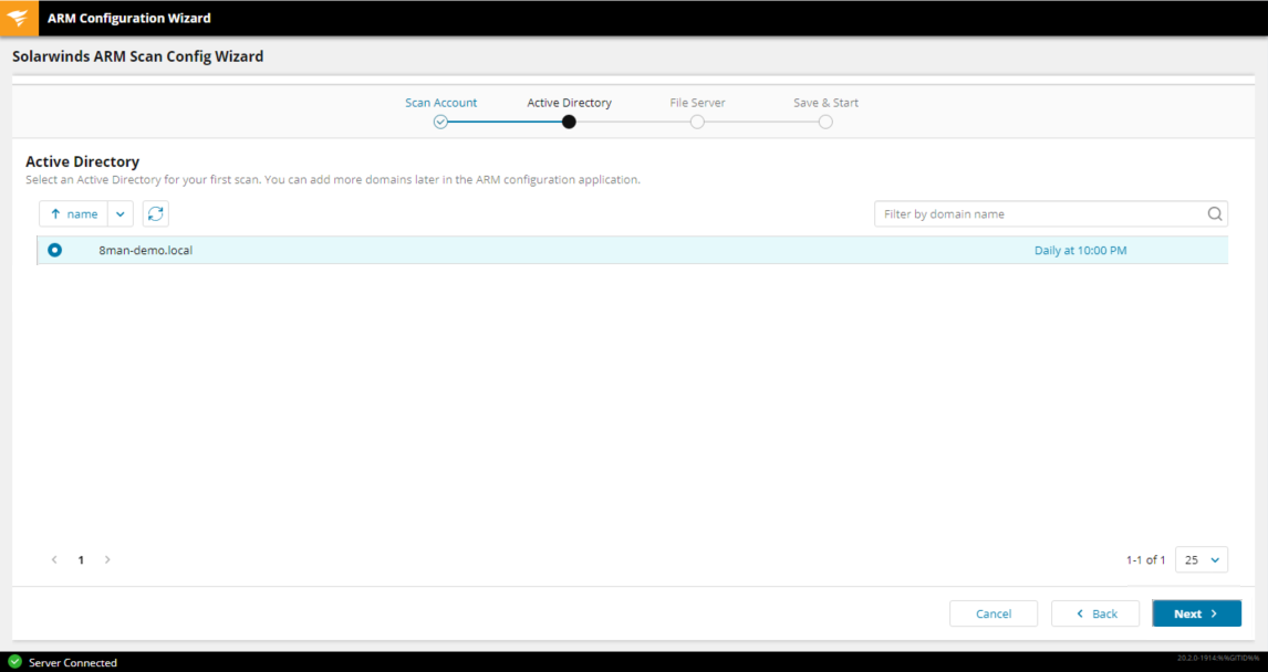In the Active directory window, select an Active Directory for your first scan. You can add more domains later in the ARM Configuration application.
