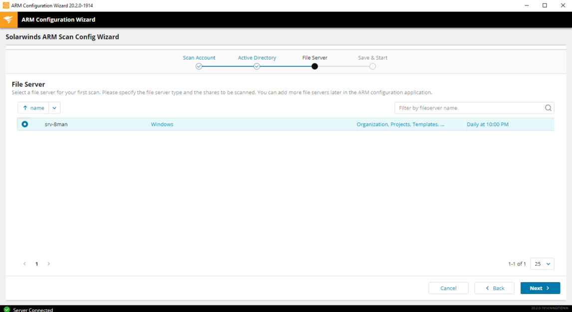 In the File Server window, select a file for your first scan. Specify the server type and shares to be scanned. You can add additional file servers in the ARM Configuration application.