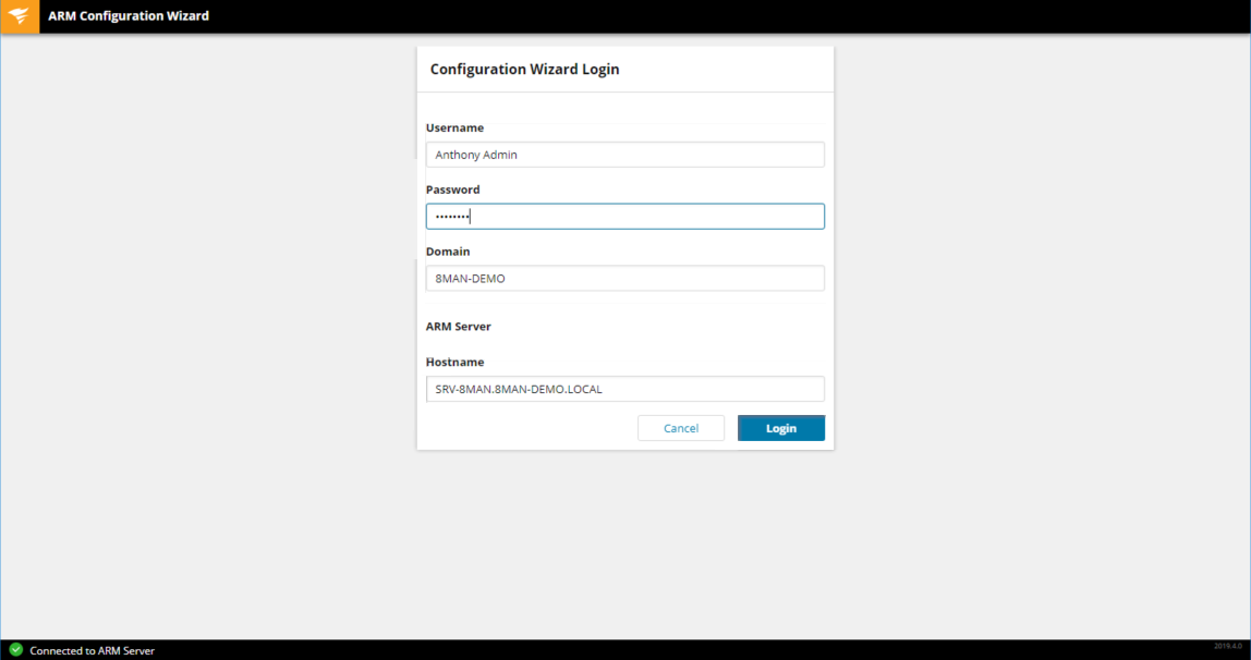 The Username, Password, and Domain fields are populated automatically when you log in for the first time. You can only log in as the user who installed ARM. Later, you can create more ARM users.