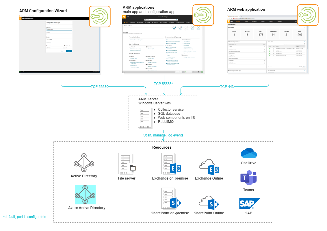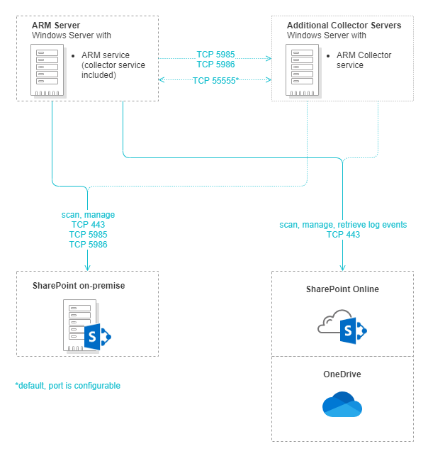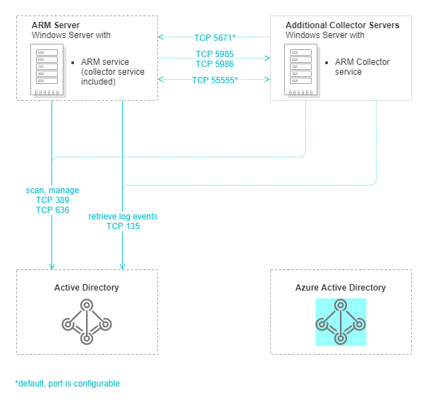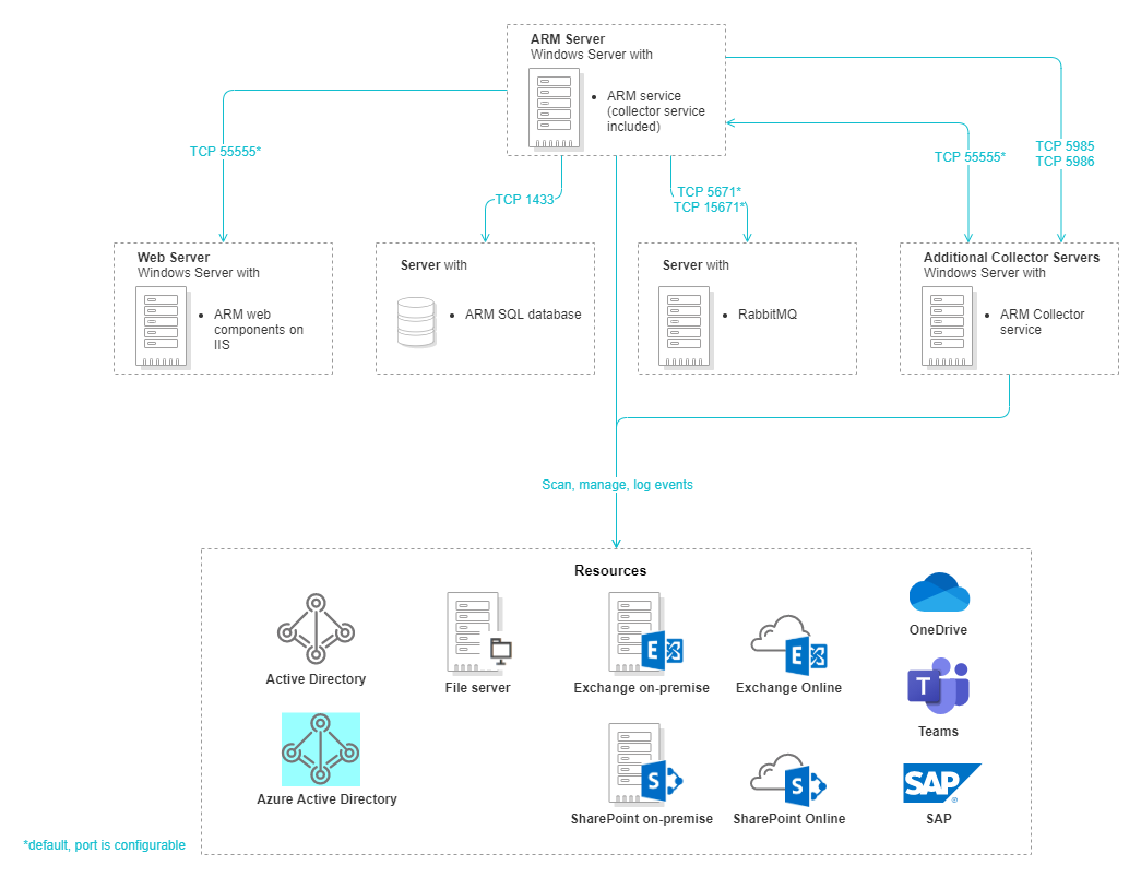 The ARM components communicate through network interfaces. The following illustrations display which ports are used in the configuration. See the system requirements for a description of each port.