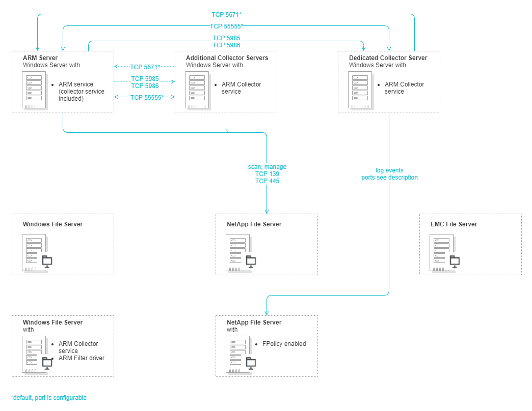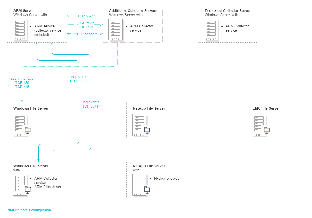 ARM uses the NetApp FPolicy feature for monitoring functions. An additional collector that processes the NetApp file server events is mandatory. The ARM server cannot be used as a collector.