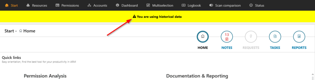 The warning icon and the yellow toolbar indicate that you are viewing historical data.