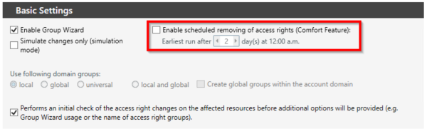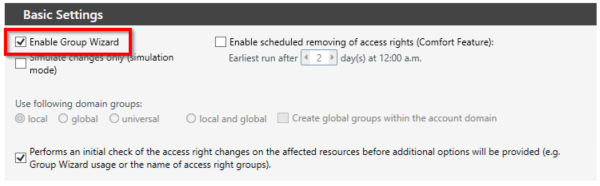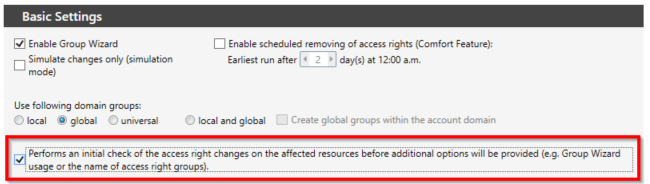 When you deselect the checkbox, before determining the required changes, a dialog box will open that allows you to make changes to the Group Wizard options. This can save a lot of time, especially if you want to perform complex access rights changes with non-standard Group Wizard options.