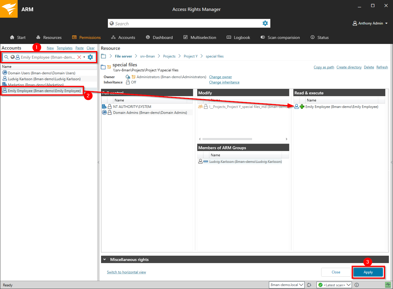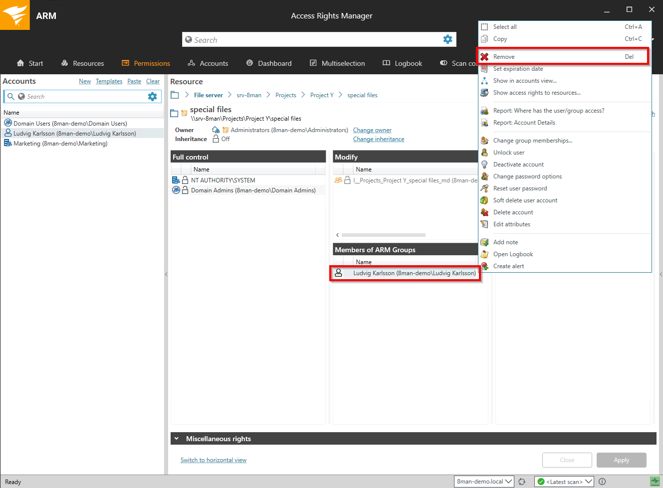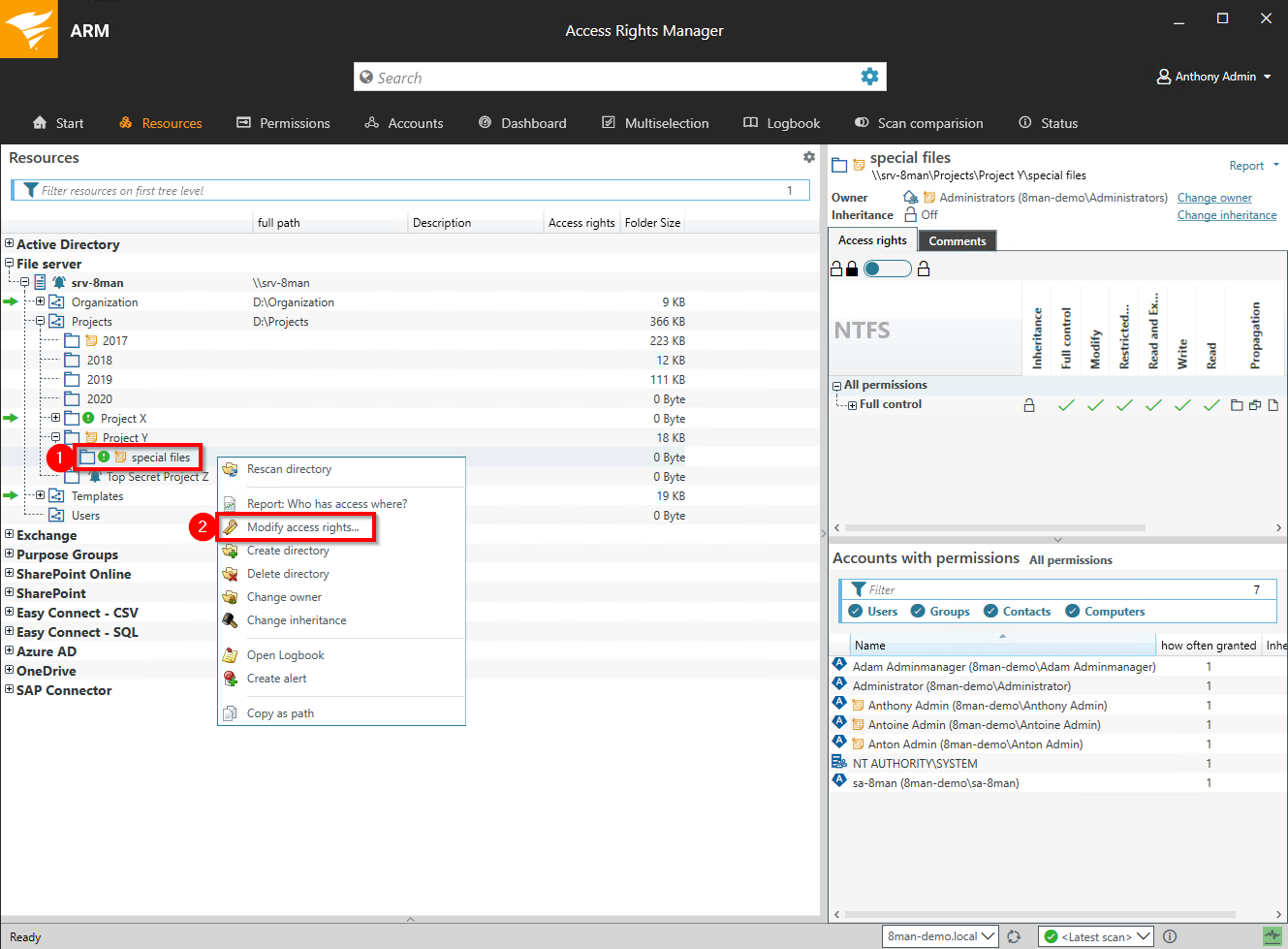Managers and team leads can use Access Rights Manager to quickly and easily create protected file server directories. This is done by creating a directory, removing all inherited rights and then adding new access rights. The result is a protected directory that only selected users have access to.