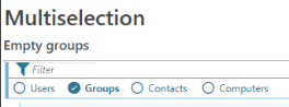 ARM switches to Multiselection highlighted in the toolbar. The Empty group scenario is active and all listed groups are empty.
