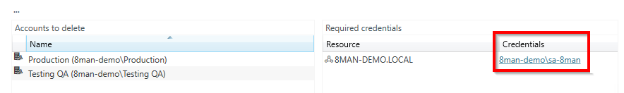 In the Delete accounts window under Credentials, change the login used to delete the groups in Active Directory.