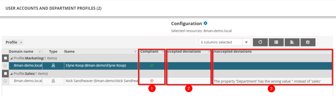 The Accepted deviations column (2) indicates if all attributes and group memberships defined in the profile match or if deviations are accepted by a responsible person.