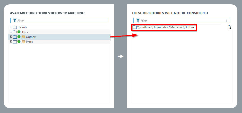 Use the filter function to find the target directories. When you filter, the tree view changes to a result list of the directory paths.