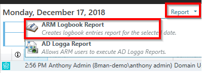 In the right menu, click the Report drop-down menu and select ARM Logbook Report.