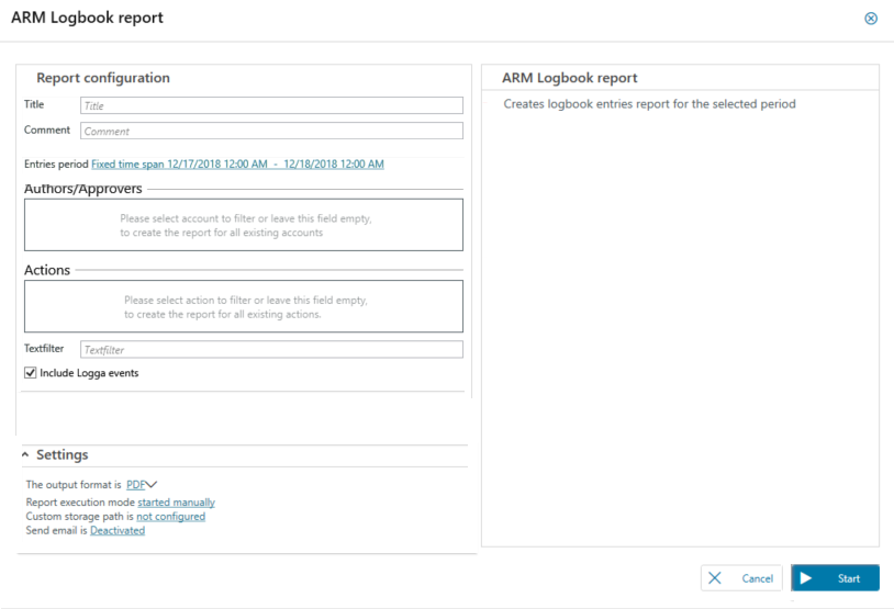 In the Author/Approvers and Actions boxes, define the range of the report.
