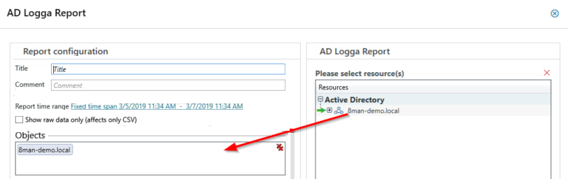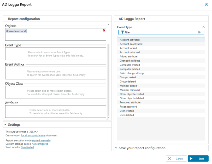 In the AD Logga Report screen, complete the remaining report configuration settings.