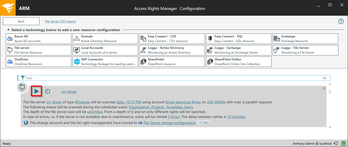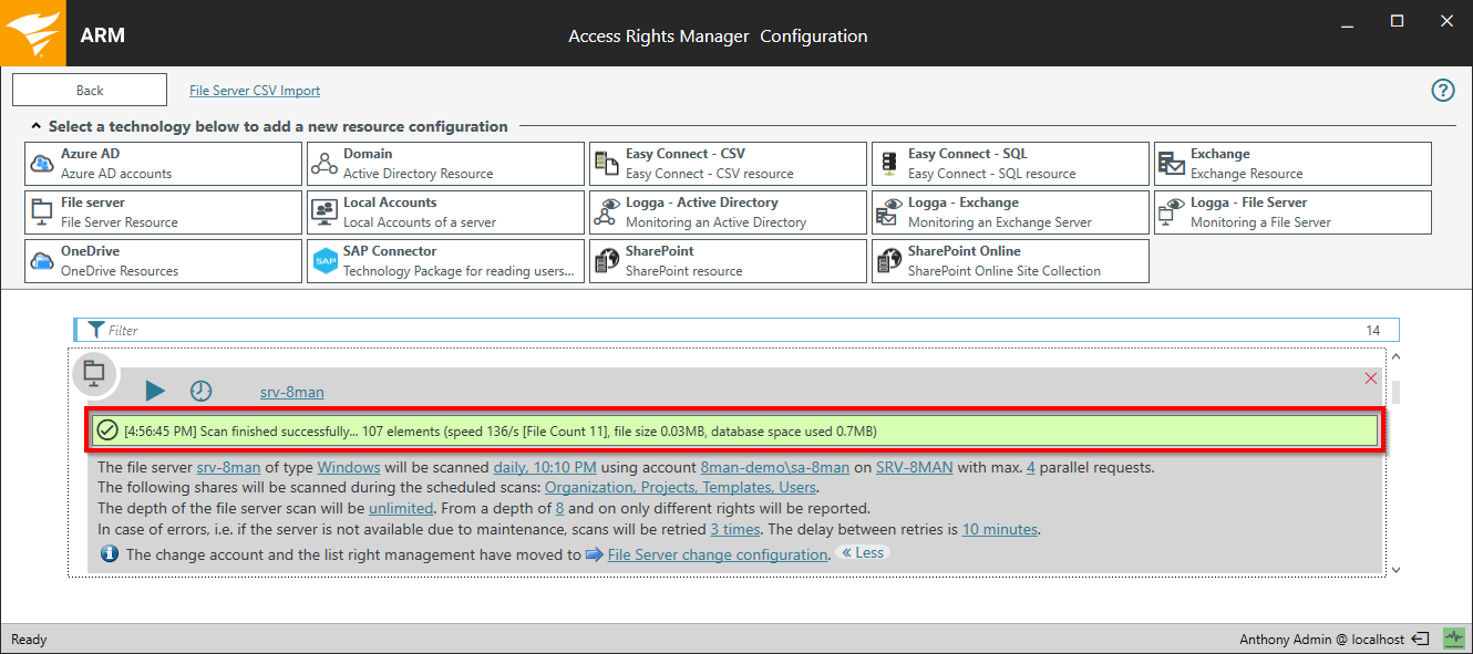 A file server scan may require an extended amount of time depending on your file server performance, load, network load, and number of file server directories required to be scanned. Initially, you can limit your scans on a few shares and minimize the scan depth.