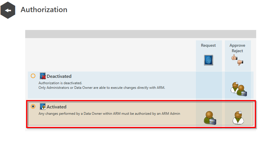 When activated, any changes performed in ARM by a data owner must be authorized by an administrator.