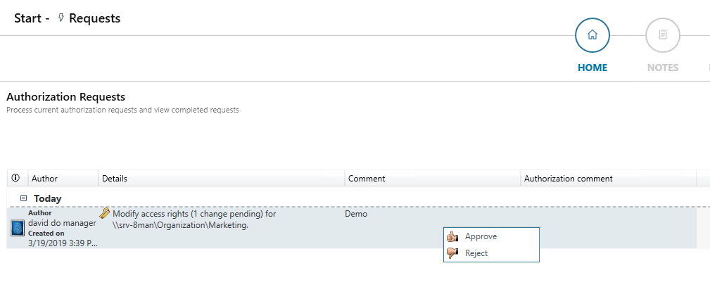 On the Start - Requests screen under Authorization Requests, right-click a request and select Approve or Reject.
