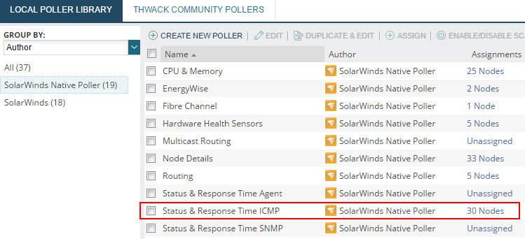 - In the Local Poller Library tab, click SolarWinds Native Poller, and locate the Status & Response Time ICMP poller.
