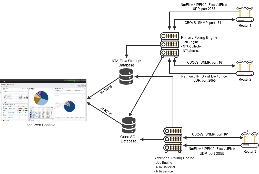 CBQoS implementations work much the same way as flow-enabled implementations, except that the NetFlow collector polls each device and the device returns data that meets the CBQoS policies you have defined. The system keeps collected data in the SolarWinds Platform database. The SolarWinds Platform Web Console is then used to navigate through the dashboard, manage the product settings, or the common features of the SolarWinds Platform products, such as alerts and reports. For more information about CBQoS implementations, see View CBQoS data in the NTA Administrator Guide.
