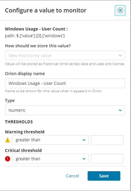 (Optional) Set Warning and/or Critical threshold values. See API poller alerts for details.