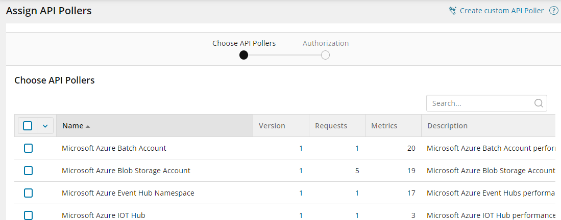 - On the next tab, select an Authorization type, specify credentials, and then click Assign Pollers.