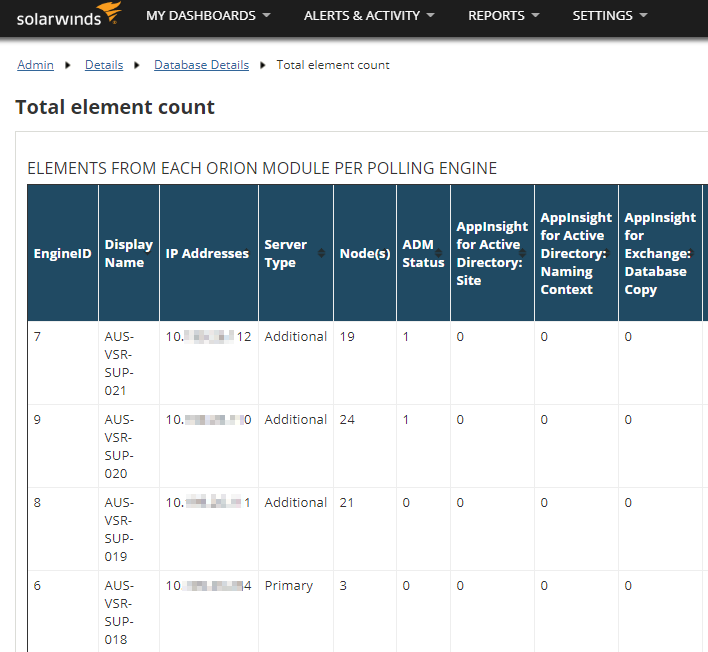 - Scroll to the bottom of the Database Details page, and then click Total elements per poller.