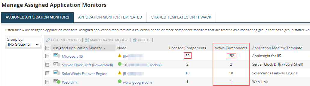 This data can be useful if analyzing heavy polling loads for AppInsight applications, which consume licenses at a fixed rate in environments with component-based licensing. The following example shows that a Microsoft IIS application monitor based on the AppInsight for IIS template only consumes 30 licenses, but 152 component monitors contribute to polling loads.