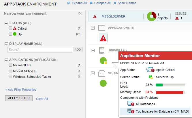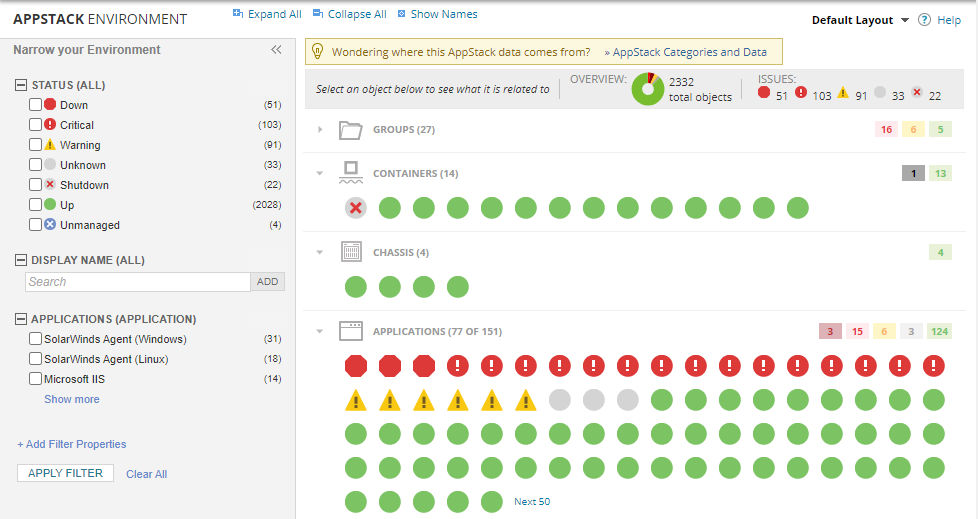To access AppStack, click My Dashboards > Home > Environment. Adjust the view with filter options and filter properties that you can save and reuse as layouts to display specific views of the AppStack. Hover over an item to display related data and status in a tooltip. Click an item to drill down and determine how it relates to other items in your environment. See AppStack data overview to understand icons for at-a-glance monitoring.