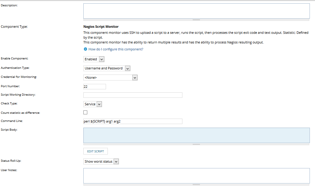 - When configuring the Nagios Script monitor, leave the script body field empty.