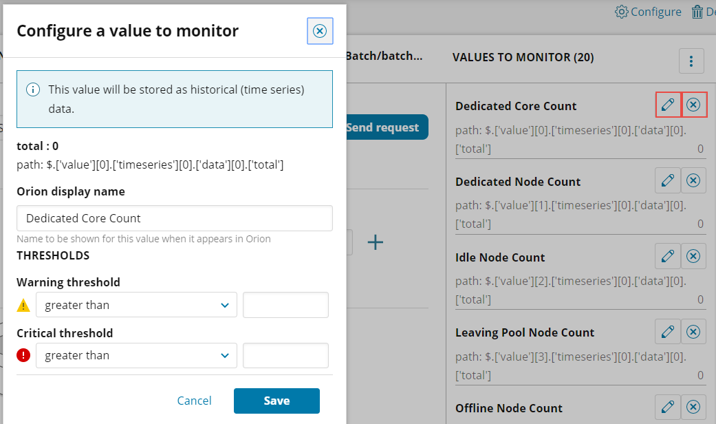 - Hover over a monitored metric to display details about it or display its parent API poller,
