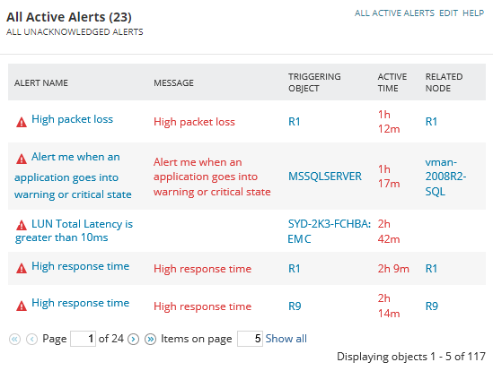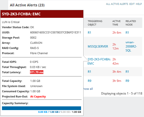 - Go to My Dashboards > Storage > Storage Summary to see the All Active Alerts widget. This shows current alerts for storage objects and all other objects monitored by SolarWinds.