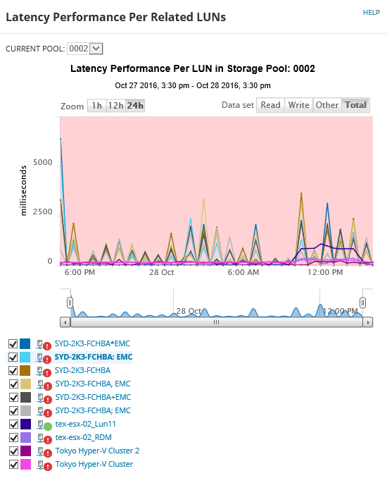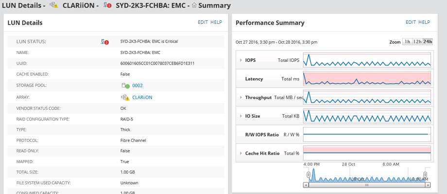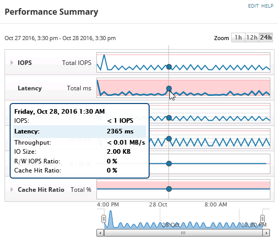 - Go to the Performance Summary widget for a more detailed view of this specific LUN's latency issues in relationship to other metrics. By moving the cursor over the chart, you can see all the performance metrics at any given time during the last 24 hours.