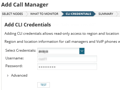 - Select or enter the CLI credentials that SolarWinds VNQM uses to collect region and location information for call managers and phones.