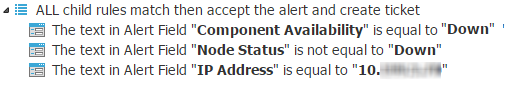 In the following All child rule example, a ticket is created when a node from an IP address is up and component availability is down.