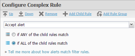 Specifies whether Web Help Desk accepts or rejects alerts based on whether they meet Any or All child rules in a complex rule. |