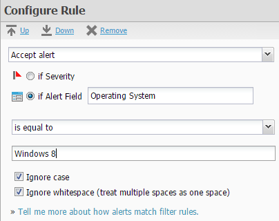 In the following example, Web Help Desk will create a ticket from all Orion alerts containing Windows 8 in the Operating System field.