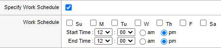 If the tech's work schedule is limited to certain hours and days of the week, select the Specify Work Schedule checkbox and select the work schedule options. If the tech works during the business days and hours configured at Setup > General > Time & Place, leave this box unchecked.