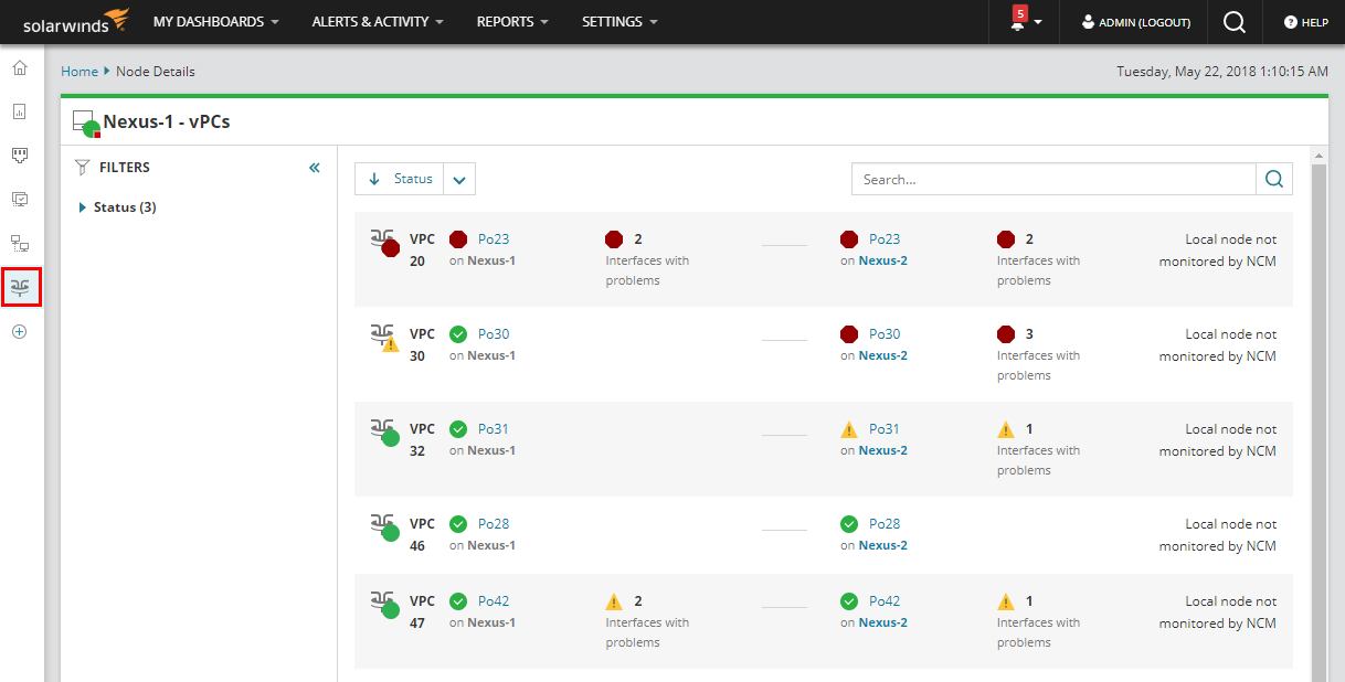 The Node Details view for your Nexus devices includes a new Interfaces subview and Nexus-relevant VPCs subview.