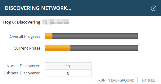 On the Network panel, if this is your first discovery, add a limited number of IP addresses. As you scale your implementation, you can use the following scanning options. Option Description IP Ranges Use this option when you want to scan one or more IP ranges. If you have many IP ranges to scan, consider adding multiple discovery jobs rather than including all ranges in a single job. Subnets Use this option to scan every IP address in a subnet. SolarWinds recommends scanning at most a /23 subnet (512 addresses max). Scanning a subnet returns everything that responds to ping, so we recommend only scanning subnets where the majority of devices are objects you want to monitor. IP Addresses Use this option for a limited number of IP addresses that do not fall in a range. A network discovery job can take a long time to complete, and so SolarWinds recommends using this option when you are first starting out. Active Directory Use this option to scan an Active Directory Domain Controller. Using Active Directory for discovery is particularly useful for adding large subnets because the discovery can use the devices specified in Active Directory instead of scanning every IP address.