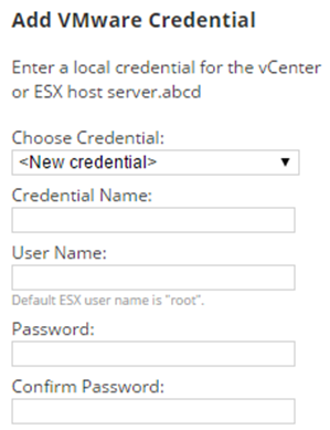 Select <New credential> and provide required information. If you do not add the host credentials, the virtual machines (VMs) on the host are still discovered. However, you will not be able to see the relationships mapped between the VMs and hosts.