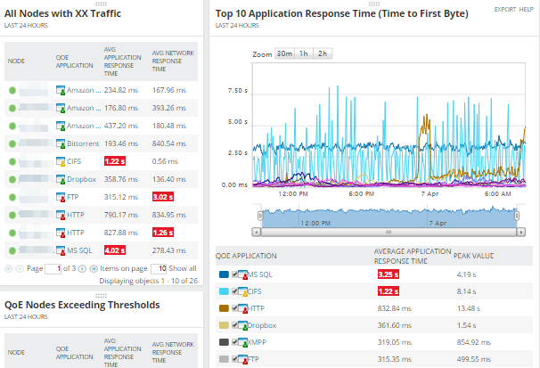 With the ability to analyze packet traffic, QoE provides real observed network response time (NRT) and application response time (ART). In addition, Packet Analysis Sensors can classify and categorize traffic for over 1000 different applications by associated purpose and risk-level.
