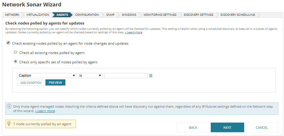 On the Agents tab in the Network Discovery wizard, you can specify whether you want the wizard to check Agent-polled nodes for updates.