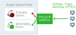 When you configure your environment for SolarWinds Platform High Availability on a single subnet, place your secondary server on the same subnet as the primary server. Configure the secondary server to use the same network and database resources as the primary server. In the SolarWinds Platform Web Console, add both servers to an HA pool, which is accessed through a single Virtual IP (VIP) address or virtual hostname to route incoming requests and messages to the current, active server.