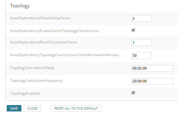 On the Global tab, search for Topology, and enter 20:00:00 as the TopologyCalculationFrequency. This setting determines how often SolarWinds Platform takes the polled data, performs calculations and places results in the Topology connections. Default node topology and topology calculation frequency should match.