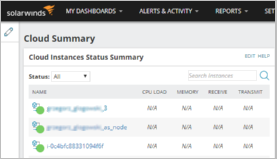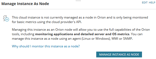 You can configure a cloud instance/VM as a managed node in the SolarWinds Platform Web Console to leverage the full capabilities of the SolarWinds Platform, including the ability to: