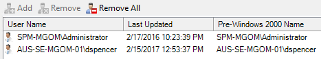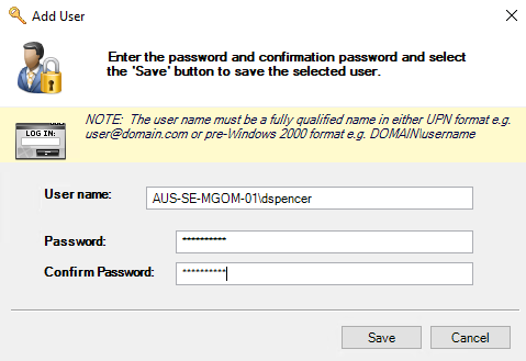 DOMAIN\usernameformat. For example, if the targeted systems are located in theAUS-SE-MGOM-01domain anddspenceris the domain administrator, enterAUS-SE-MGOM-01\dspencerin the User Name field.