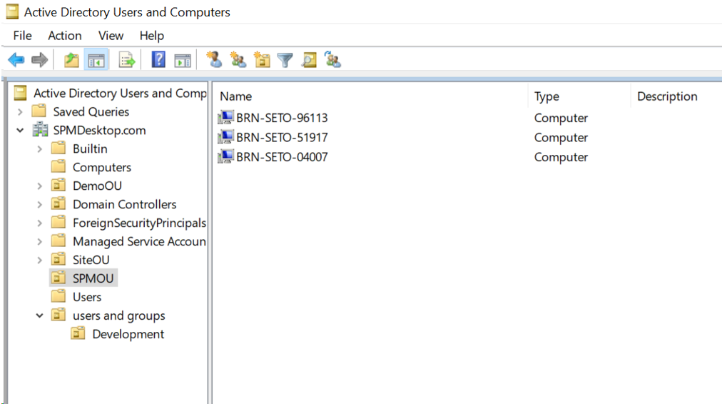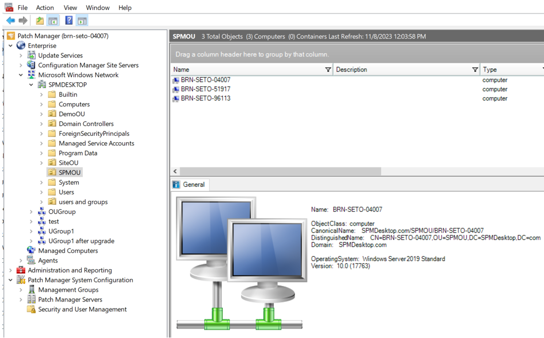 When you add the domain in the Patch Manager Console and scope the domain and corresponding OU of the domain in the console, the computers should be listed, as shown below.