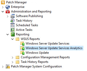 When the task completes, the data is stored in the Patch Manager SQL Server database. You can access the data by generating a report from the Windows Server Update Services Analytics category. These reports are located in the Reporting menu.