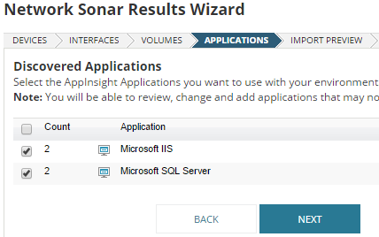 After the Discovery Wizard analyzes available devices and interfaces in your network, the Network Sonar Results Wizard opens, allowing you to import network elements into SAM. Discovered servers (that is, nodes) do not count against node-based licensing; only servers that you import into the SolarWinds Platform database count against your license.