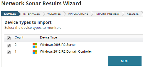 - Make sure that only the device types you want to monitor are selected, and click Next.