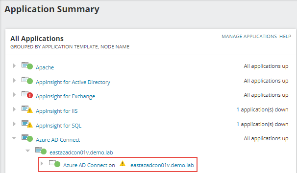 Allow time for widgets to populate with data. Expand applications to display individual application monitors assigned to specific nodes.