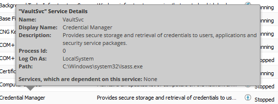 Accessed via the Management widget on Node Details views, the Service Control Manager shows all services on the monitored computer. Hover over the row of any service to display details about it.